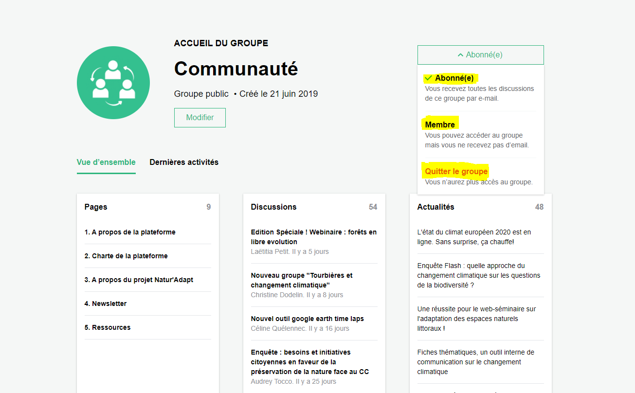 - Abonné(e) : Vous avez accès au groupe et vous recevrez un mail pour vous notifier de chaque nouvelle discussion, ou réponse dans un fil de discussion.