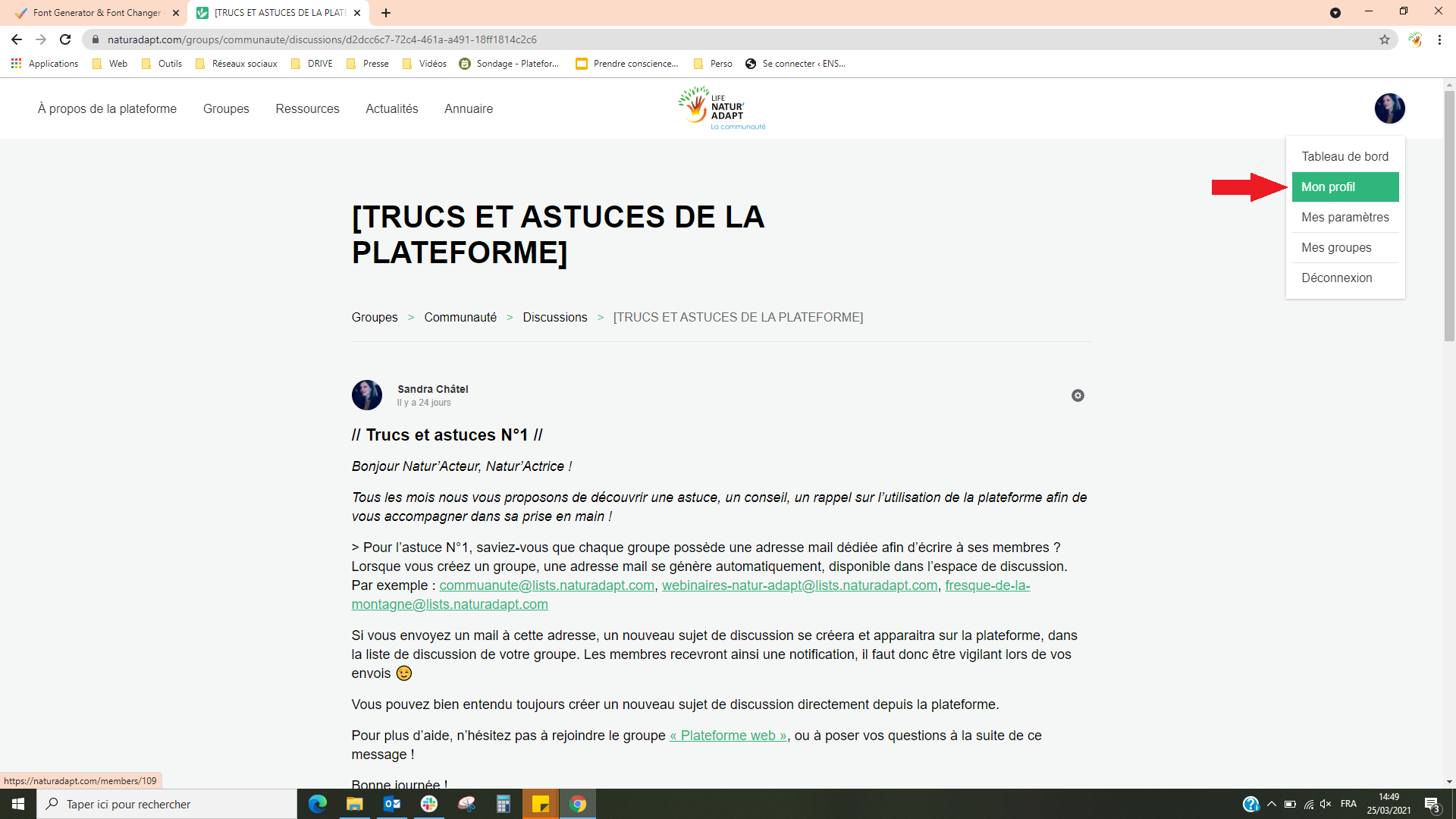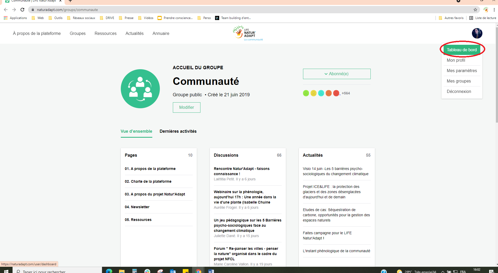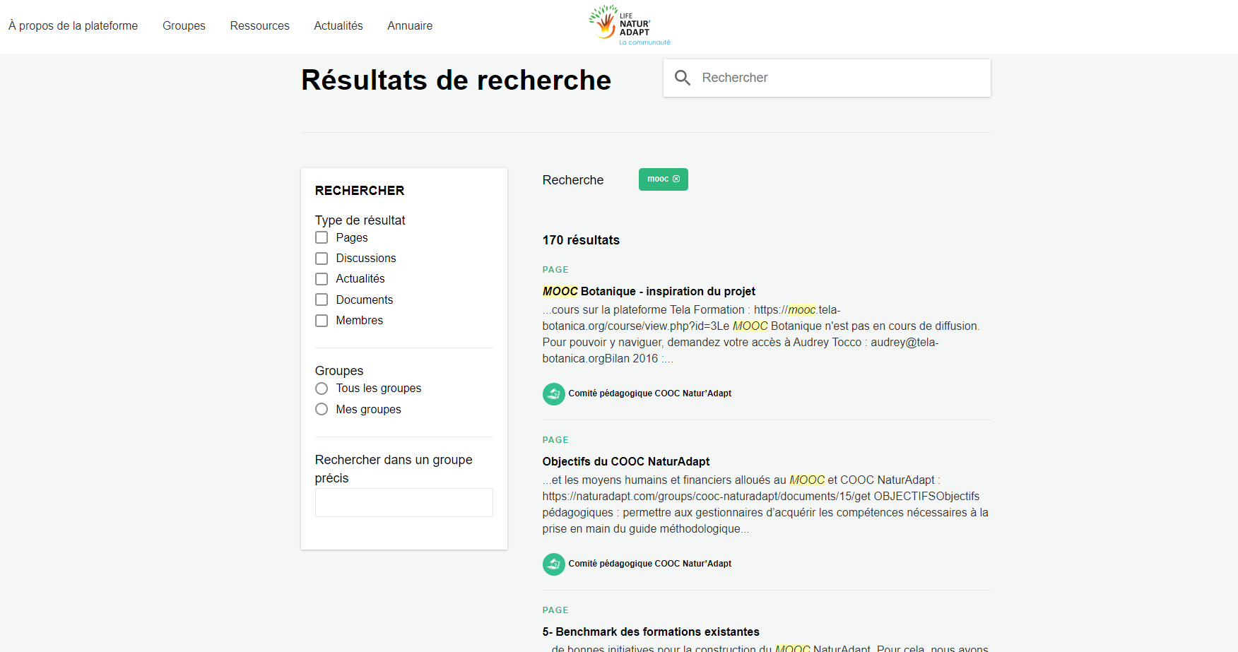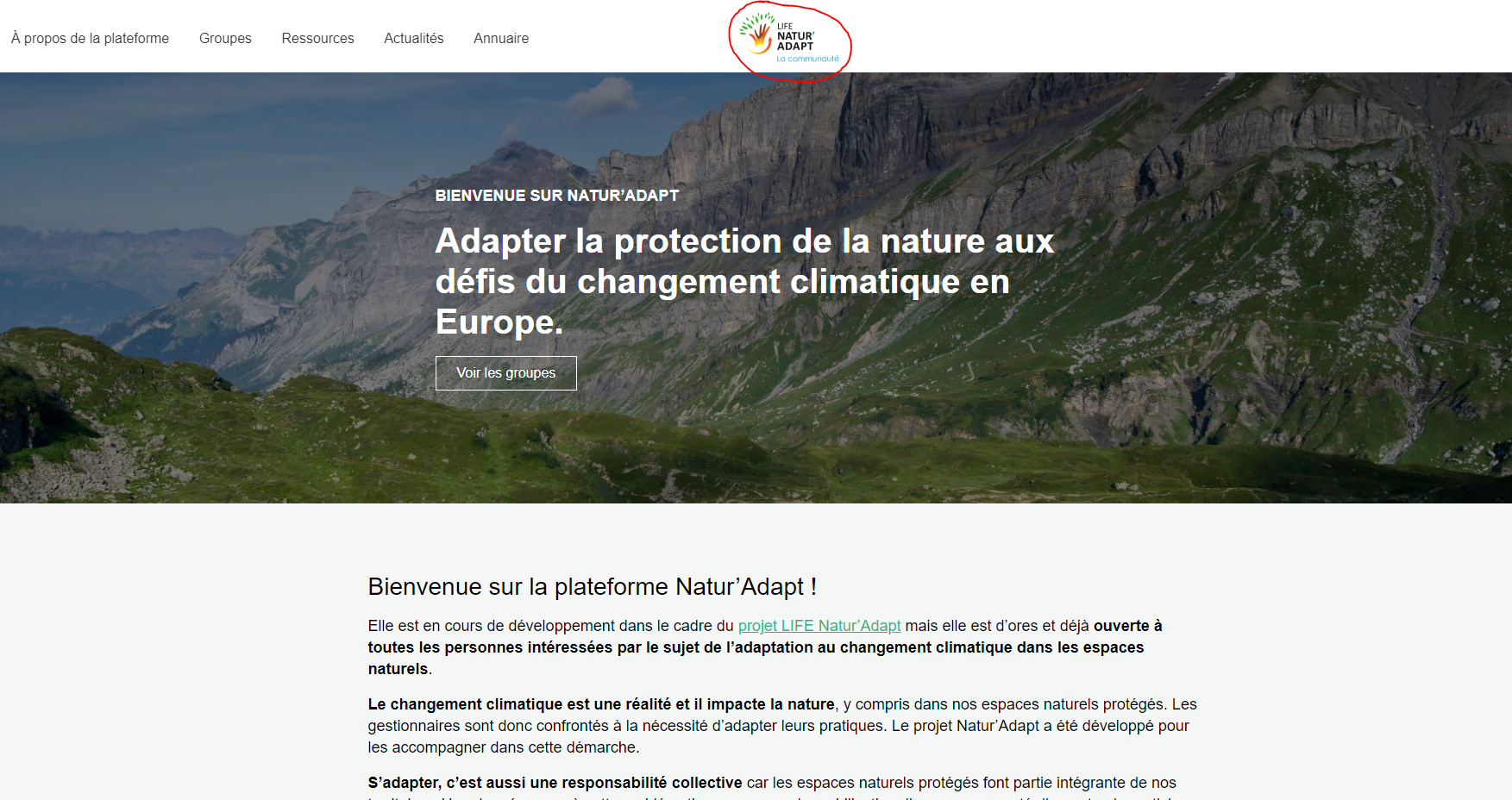 Pour accéder directement à la communauté, sans passer par la page des groupes, cliquez sur le logo “LIFE Natur'Adapt : La communauté” en haut de votre écran !