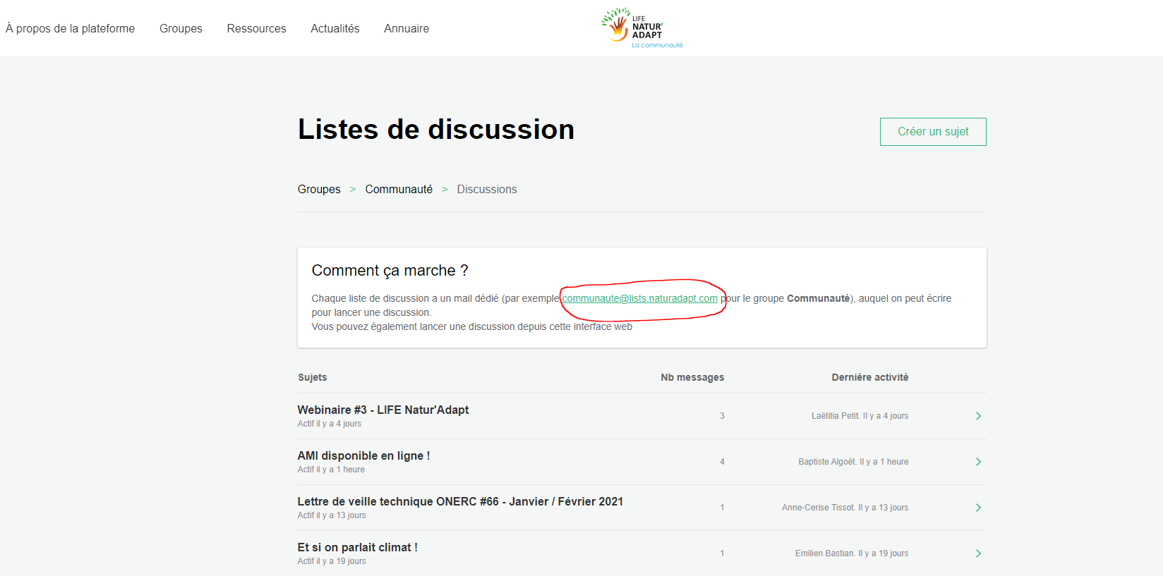 Lorsque vous créez un groupe, une adresse mail se génère automatiquement, disponible dans l’espace de discussion. Par exemple : commuanute@lists.naturadapt.com, webinaires-natur-adapt@lists.naturadapt.com, fresque-de-la-montagne@lists.naturadapt.comSi vous envoyez un mail à cette adresse, un nouveau sujet de discussion se créera et apparaitra sur la plateforme, dans la liste de discussion de votre groupe. Les membres recevront ainsi une notification, il faut donc être vigilant lors de vos envois 😉